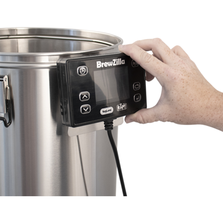 The RAPT Controller is mounted to the top of the boiler body, allowing for easy operation when you have the unit set on the ground. The controller can be tilted upwards to give you an even better view, or it can be removed from the BrewZilla entirely if you’d prefer to mount the controller on your wall or place it elsewhere. From the controller, you’ll orchestrate your entire brew day. Program mash steps, dial in element power, and operate the integrated pump all from one screen.