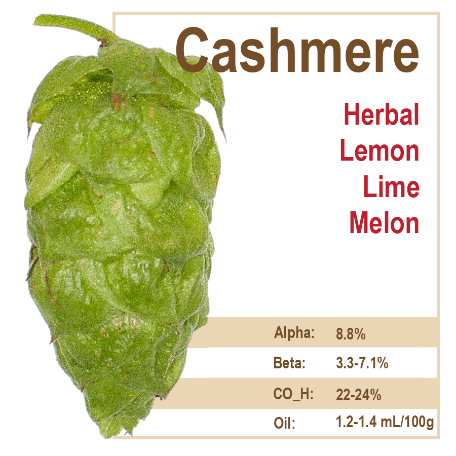 A good dual-purpose hop, Cashmere showcases flavors lemon, lime and melon, exhibits a smooth bitterness and is mildly aromatic with a subtle herbal bouquet.