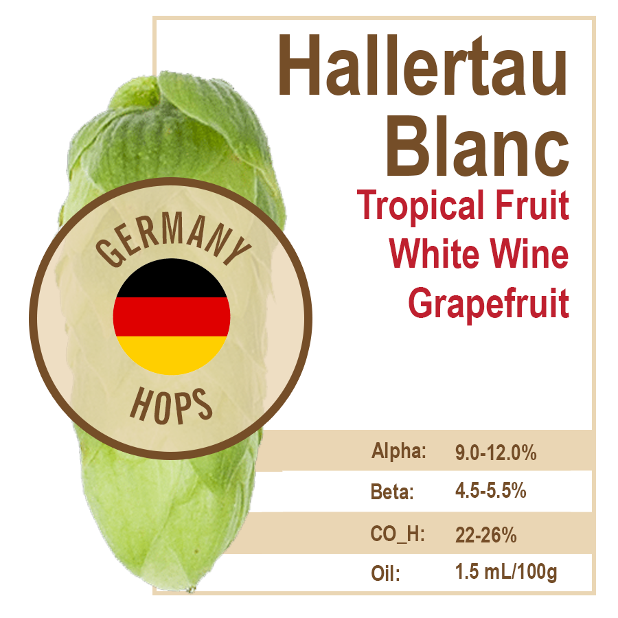 Hallertau Blanc is a new German variety with a bouquet of sweet and tropical fruits, but what makes it so distinctive is a unique white wine character. Hallertau Blanc was bred at the Hüll Hop Research Center and released in 2012. It is one of the new varieties which have been bred and commercialized in response to craft brewers searching out bigger, bolder, and more unique hop aromas.