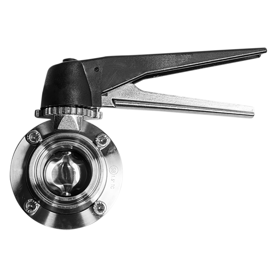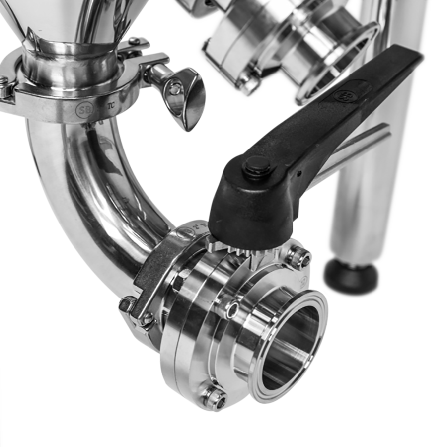 Spike's conicals come equipped with this 100% sanitary 2.0” TC butterfly valve. This valve has a squeeze locking/trigger handle that allows for 180 degrees of motion and 13 locking positions.