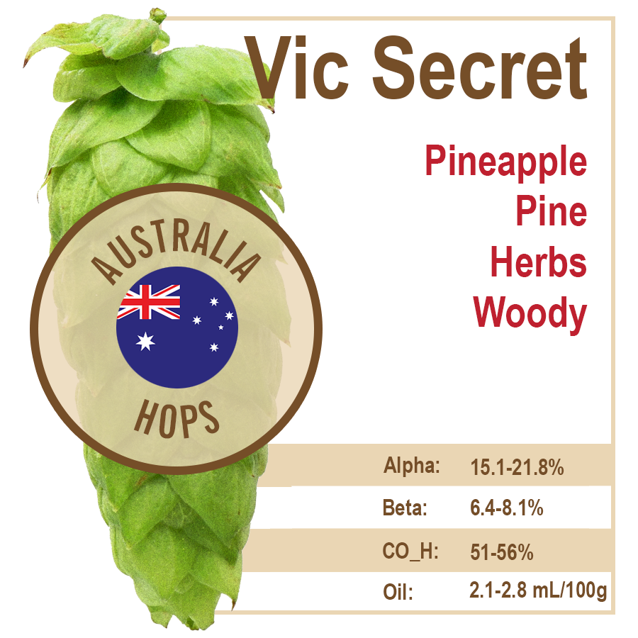 Vic Secret had her first commercial harvest in 2013. Developed in 2000 in Victoria, Australia alongside sister variety Topaz, Vic Secret features elements of tropical fruit, herbs and pine with clean notes of pineapple and passionfruit.